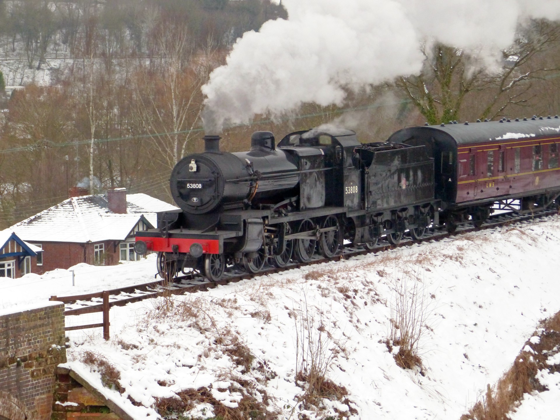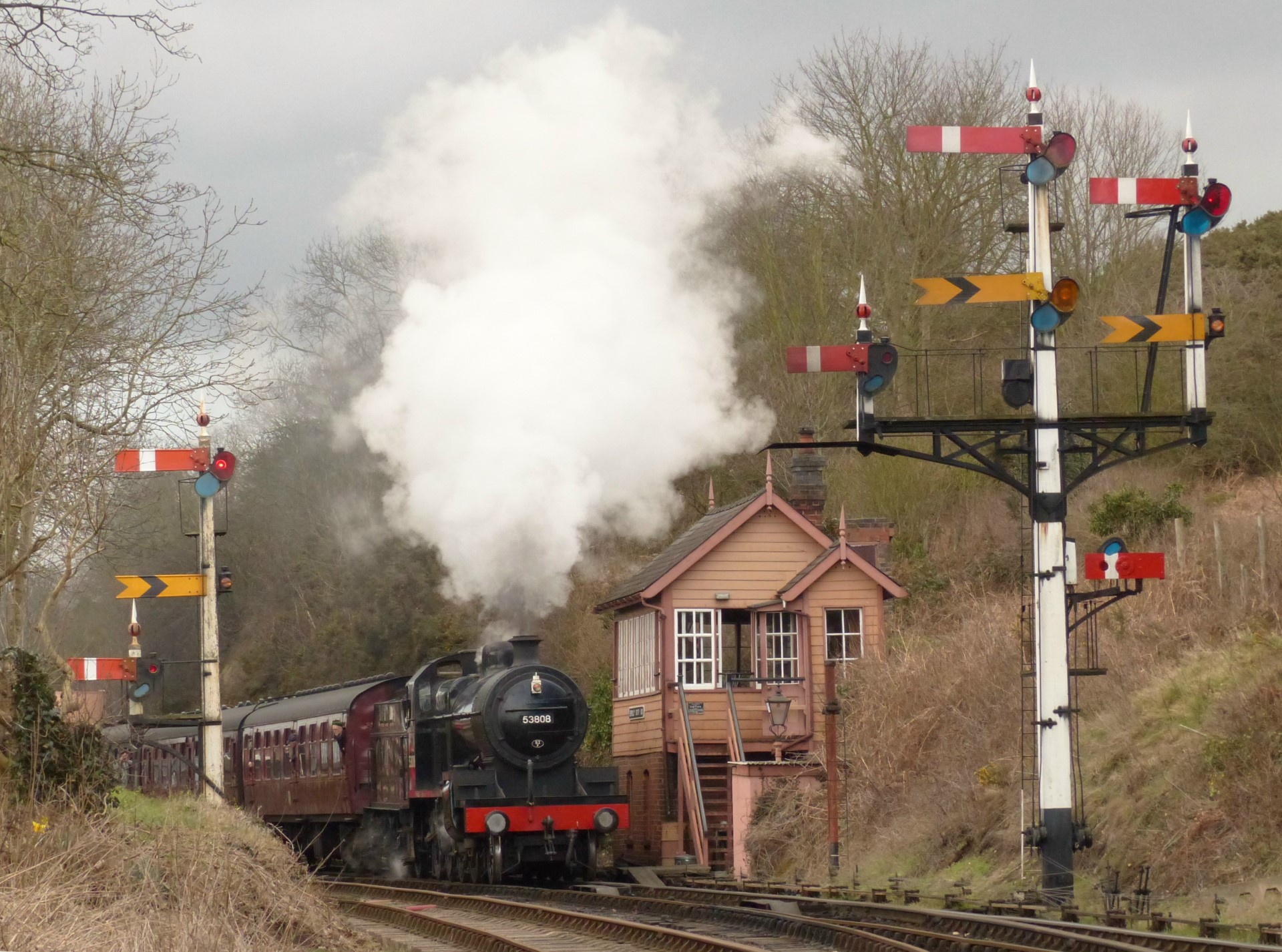 The first three photos show 53808 on the 11.00 am from Bridgnorth on Friday whilst passing Bewdley South signalbox at about 12.20 pm. The final picture, taken two days later, shows a rather different scene, weather-wise, and 53808 also was no longer on the B1's diagram but the preceding one. [Photos by Bob Curtis]