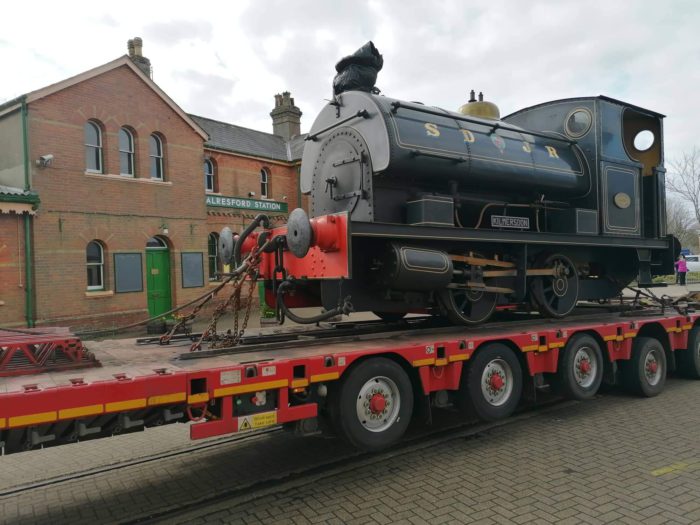 The Trust’s 1929-built Peckett ‘Kilmersdon’ – the last steam engine to work the Somerset coalfield – arrived at Alresford today and was then towed to Ropley for assessment.