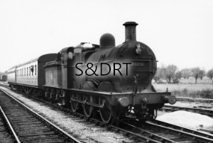 MR 1P (58XXX) loco with two-coach passenger service near Glastonbury, 1951