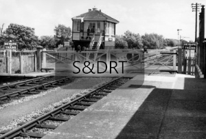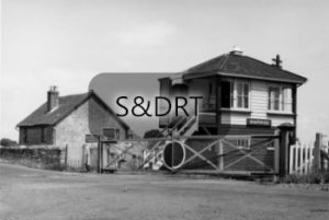 Shapwick station; signalbox and station master’s house viewed from far side of level crossing, 1960