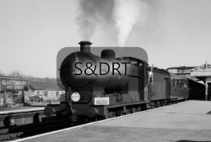 Ex-SDJR 4F class No. 44560 (built in 1922 as SDJR No. 60, withdrawn August 1965) with an Up (towards Highbridge) special; the Southern Counties Touring Society (SCTS) The Southern Wanderer, at Glastonbury & Street station on Sunday 28 March 1965. Leading carriage from set 290; fireman holding single line token.