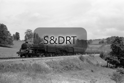 No. 75072 leaves Midford with a Down local service; platelayers’ hut to right. June 1962.