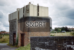 Chilcompton station looking west from the approach road showing station building, entrance gate, water tower and Up side waiting shelter. Summer 1961.