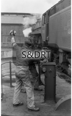 Here, Donald (facing camera) and Peter are turning BR Standard Class 5 No. 73019 at Bath Green Park loco depot.