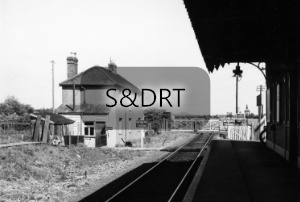 Edington Burtle, view including station house looking north from the platform. Note two ‘BEWARE OF TRAINS’ signs and level crossing beyond. Photo taken c.1960.