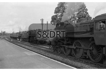 Meanwhile, BR Standard Class 4 No. 75009 (built 1951) stands in the centre siding, probably awaiting an Up service in need of piloting.