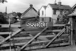 A view at Henstridge station looking south-west from level crossing towards Blackmoor Lane, gate in foreground, agent’s house on right. Note chain on crossing gate and measuring stick.
