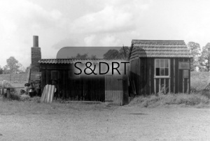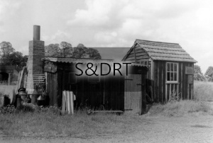 A view of Henstridge station showing the permanent way hut (left) & lamp hut (right with missing window pane) at the north-west of the site, viewed from the south; overbridge no. 159 (A30 Shaftesbury Road) beyond left. Note grindstone wheel on left.
