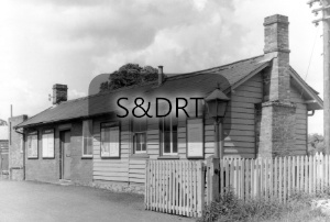 Henstridge station; station building looking north from Blackmoor Lane station approach, showing gate & lamp, urinal to far left. Note ‘£25 Reward’ notice on wall at right end of building.