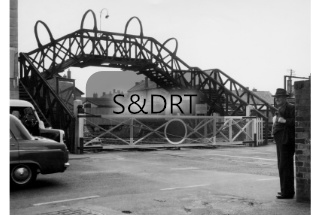 Highbridge; Church Street level crossing and footbridge no. 283, looking south from road by signalbox, gates open to road traffic. Photo believed to have been taken in the 1960s. The person on the right might be the signalman.