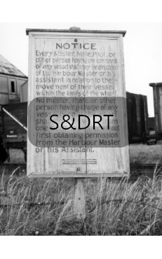 Highbridge Wharf; painted notice from Harbour Master to those in command of vessels, near dockside sheds, 13T open wagon behind. Photo believed to have been taken in the 1960s.