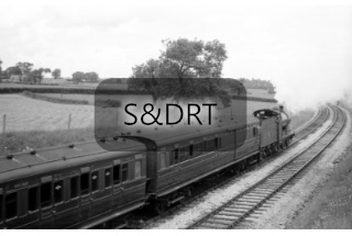 LMS class 4F 0-6-0 locomotive no. 4411 (built Derby 1927, withdrawn 1964 as BR no. 44411) with northbound passenger train of three carriages, possibly 11.45am ex-Templecombe, just past Masbury summit, leading two carriages formed of SR set no. 420 (no. 5129, D283, 56′ CK built 1910 & no. 3157, D132, 56′ BTK, built 1913) set withdrawn 1949, Wednesday 6 July 1938.