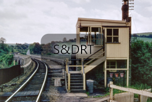 Midford signalbox looking south. Whitaker tablet apparatus in front of box and permanent way gang huts beyond – rails visible extending from huts perpendicular with the S&D track. Three S&DJR fire buckets on signalbox wall below steps. No date available for this image but likely to be Summer 1962. See also WSHSD_2018_1_12 which is believed to be a much later image.