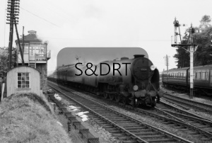 Ex-SR ‘Lord Nelson’ LN class 4-6-0 locomotive No. 30854 ‘Howard of Effingham’ (with 71A Eastleigh shedplate, withdrawn September 1961) empty coaching stock (ECS) passing Bournemouth West Junction signal box from Branksome station, with SR headcode no. 14 (Waterloo & Bournemouth West, train reporting no. 260). Saturday 22 July 1961.