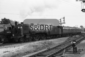 Ex-SR ‘Schools’ V class 4-4-0 No. 30912 ‘Downside’ (allocated to 70A Nine Elms) on the 4.15pm passenger train to Waterloo, leading carriage with set no. 266 (recorded by Southern Railway Email Group as disbanded in 1948). Showing SR headcode no. 14 (Waterloo & Bournemouth West, train reporting nos. 36 & 311). Note engineman on tender of ex-SR rebuilt Bulleid ‘West Country’ class No. 34016 ‘Bodmin’. Saturday 22 July 1961.