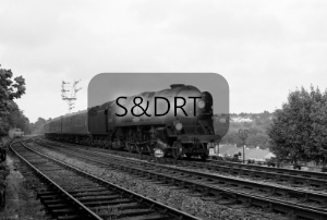 Ex-SR rebuilt Bulleid ‘Battle of Britain’ class 4-6-2 locomotive No. 34085 ‘501 Squadron’ (with 71B Bournemouth shedcode) on the 3.30pm Waterloo to Bournemouth West passenger service with SR headcode no. 14 (Waterloo and Brockenhurst & Bournemouth West) passing Gas Works Junction, Branksome triangle. Thursday 19 July 1962.