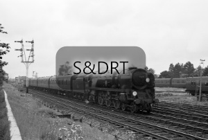 Ex-SR rebuilt Bulleid ‘Merchant Navy’ class 4-6-2 locomotive No. 35029 ‘Ellerman Line’ (allocated to 70A Nine Elms) passenger train arriving Bournemouth West with SR headcode no. 14 (Waterloo and Brockenhurst to Bournemouth West, train reporting no. 28), Bournemouth West Junction signalbox extreme left. Thursday 19 July 1962.