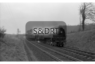 West Country Class No. 34045 Ottery St. Mary is seen on what is almost certainly a through service (having at least eight carriages) near Oakley (Basingstoke).