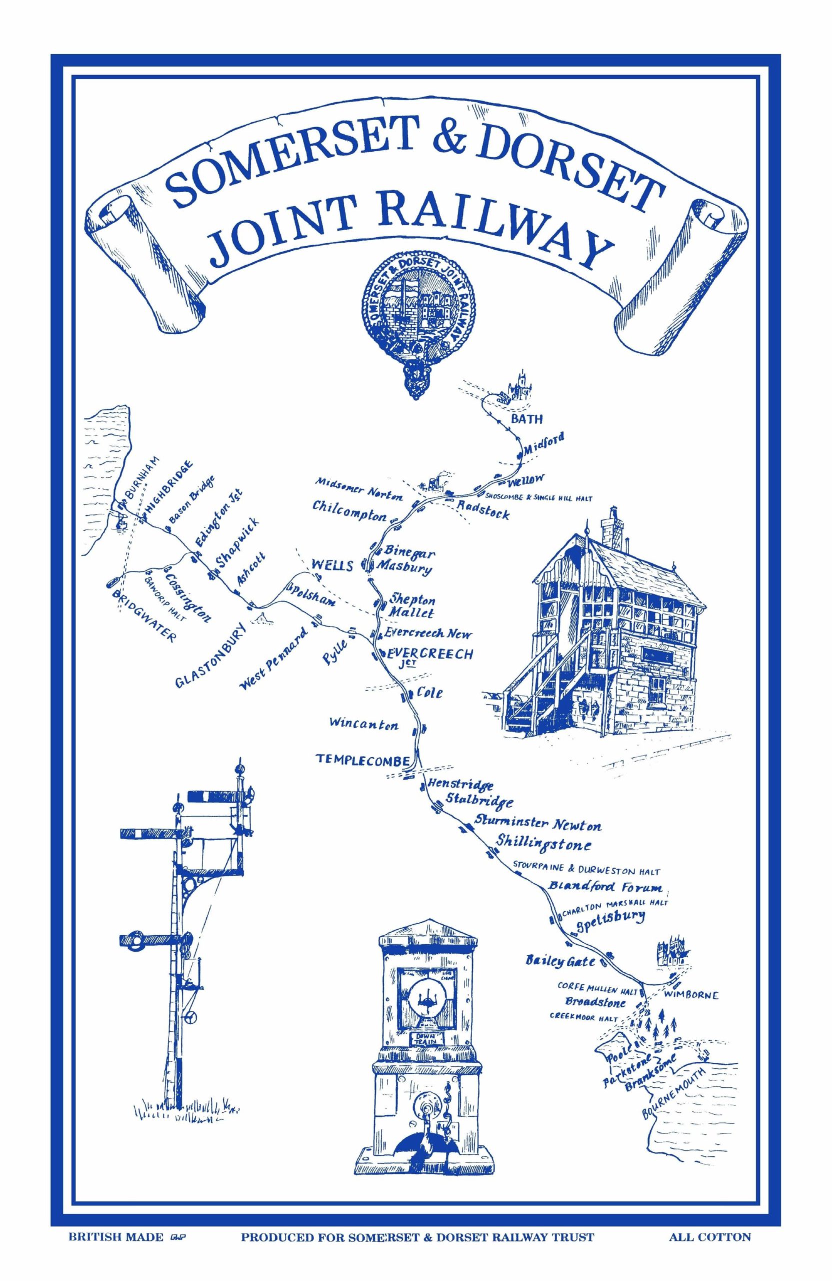Tea Towel showing the complete map of the SDJR including branches. In blue or green.