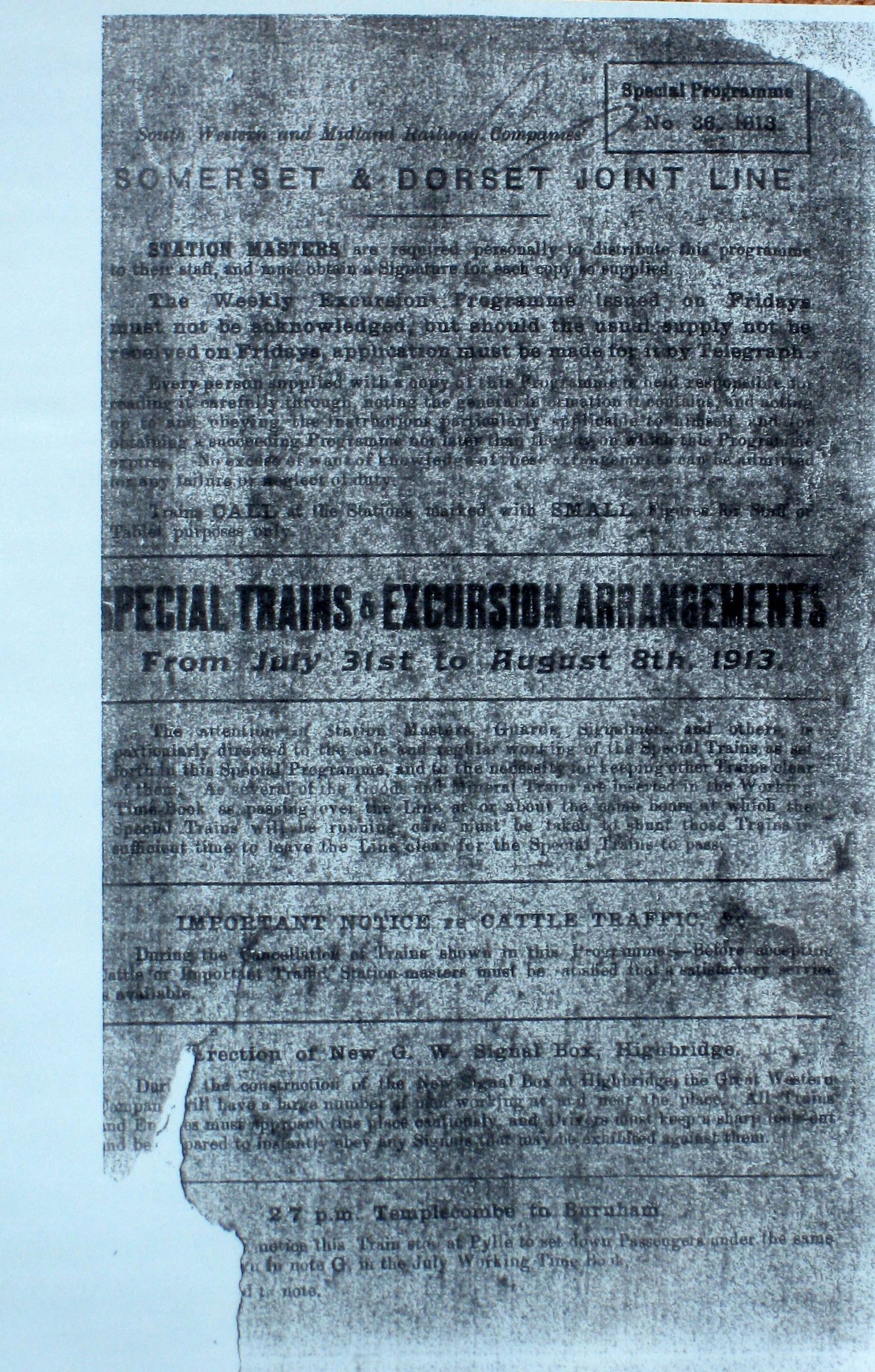 Reprint of the Somerset & Dorset Railway Working Timetable of Special trains and Excursion arrangements from July 31st to August 8th 1913