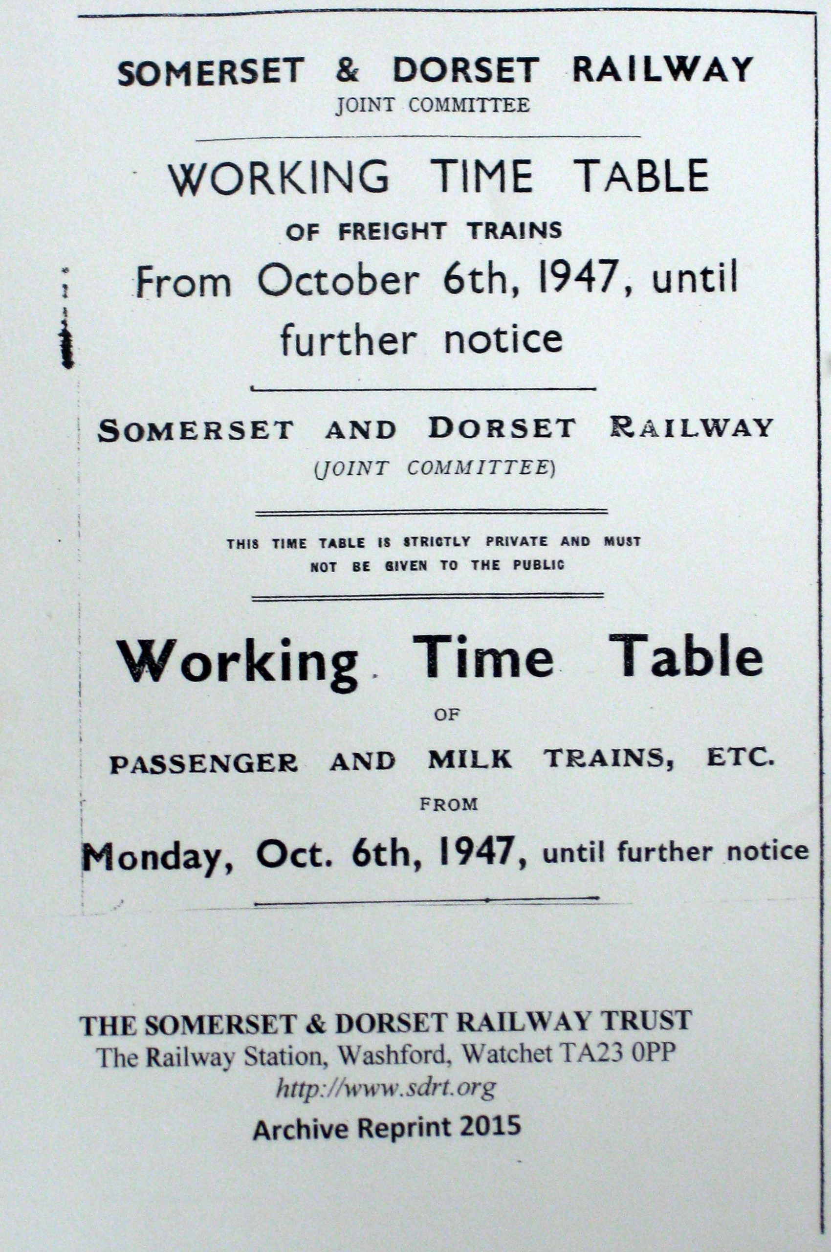 Reprint of the Somerset & Dorset Railway Working Timetable of Passenger and Milk Trains from October 6th 1947 until further notice