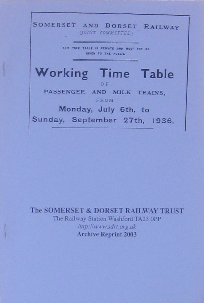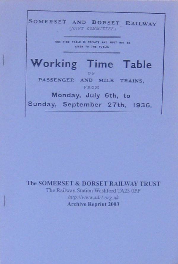 Reprint of the Somerset & Dorset Railway Working Timetable of Passenger & Milk trains from July 6th until September 27th 1936.