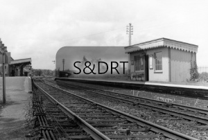 Looking north across the tracks to the Down platform at Shillingstone station showing the famous ‘square up’ telegraph pole and the waiting room.