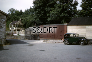 The corner of the goods shed is on the left, the Down platform adjacent, and the greenhouse and signalbox on the Up platform can be seen beyond. A car, registration no. BAE 630, is parked in the yard.