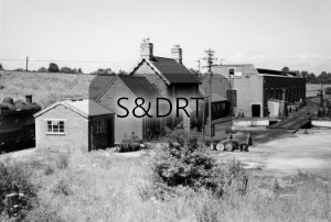 Templecombe Lower Yard in August 1965. Dorset Central Railway station building and motive power depot viewed from the south, turntable on right, Ivatt 2MT 2-6-2T locomotive No. 41307 on left. Spur line to Templecombe Upper in background.