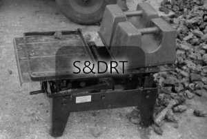 Weighing machine outside the weighbridge office at Glastonbury & Street station, next to the coal heap. Set to weigh 112lb (two 56lb weights). Label recording a repair by F. Cullen & Co., Taunton. Photo taken c.1960.