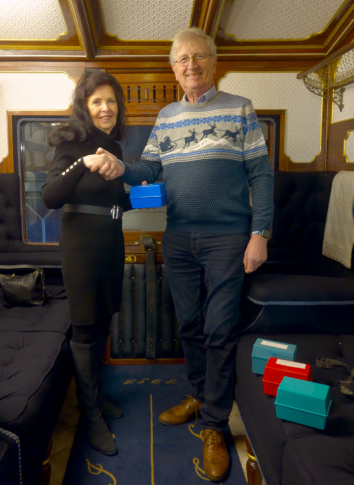 Our photo shows Mrs. Richardson handing over four boxes of negatives to Ian Young, Chairman of S&DRT Ltd. in our fully restored S&D First Class Coach No.4 – built in the S&D’s own works in Highbridge in 1886. The black & white negatives number around 500 of the S&D with another 500 taken elsewhere in the south of England.